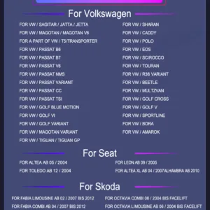 For Seat Leon (2006-2013) For Seat Toledo (2004-2015) For VW Golf 6 (2009-2013) For Seat Alhambra (2010-2016) Works for Skoda: For Skoda Fabia / Fabia Combi (2007-2014) For Skoda Octavia (2005-2013) For Skoda Roomster (2006-2014) For Skoda Superb (2008-2014) For Skoda Yeti (2008-2017) |